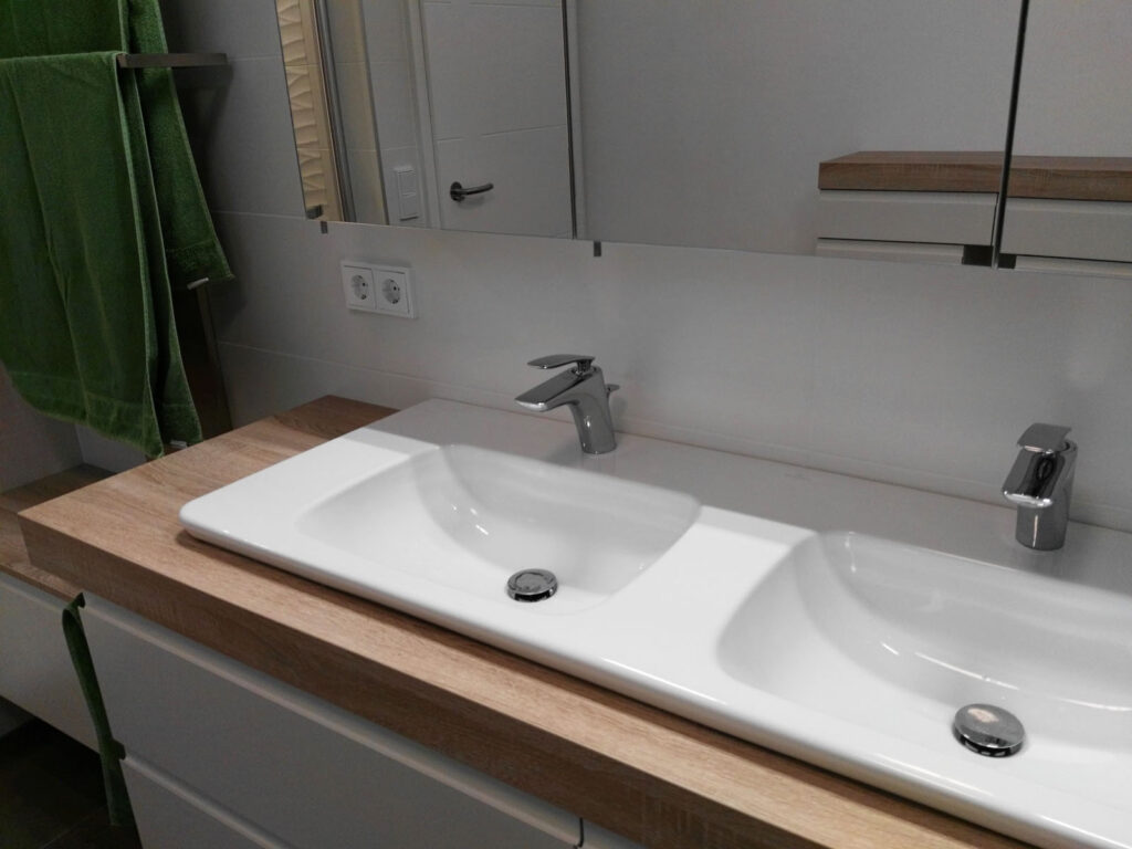 Dieses Badezimmer ist mit einer 8cm dicken Waschtischplatte ausgestattet, in diese ist ein weißer Keramik-Doppelwaschtisch eingebaut.