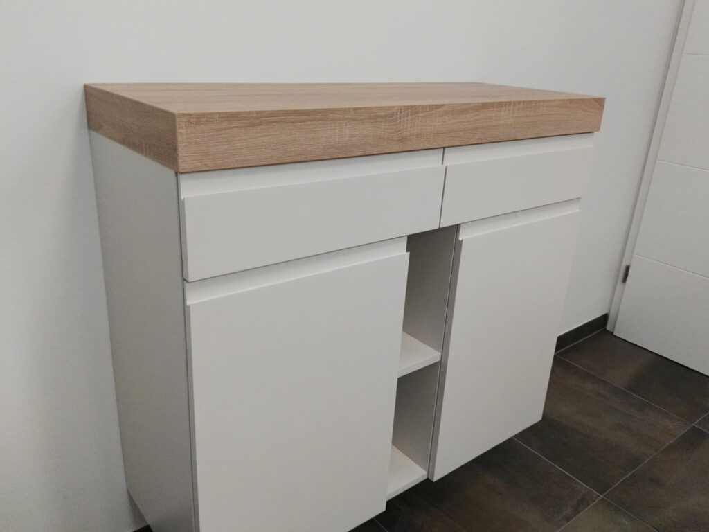 Alle Möbelfronten sind in Farbe Weiß pulverbeschichtet und stehen im Kontrast zu den Eichen-Holzteilen.