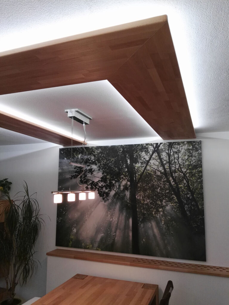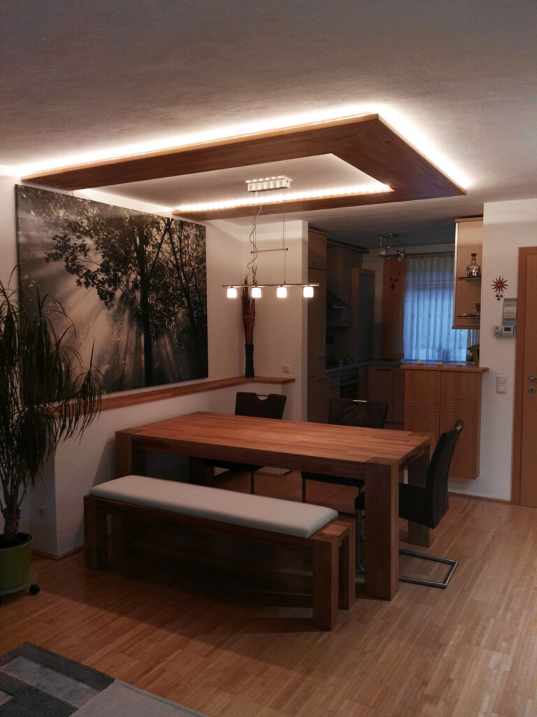 Deckenelemente in Buche Natur geölt sind nun über dem Essplatz angebracht, die indirekte Beleuchtung verleiht dem Ganzen einen schwebenden Charakter.