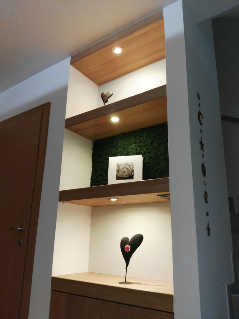 Ein Wunsch des Paares war es die bestehende Mauernische für Präsentationszwecke zu gestalten. Hier durfte ein Stauraum unter den beleuchteten Borden nicht fehlen.