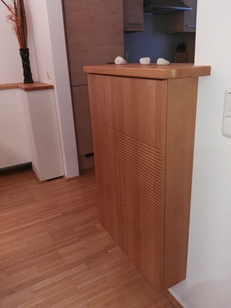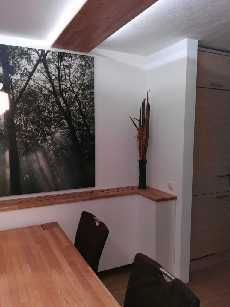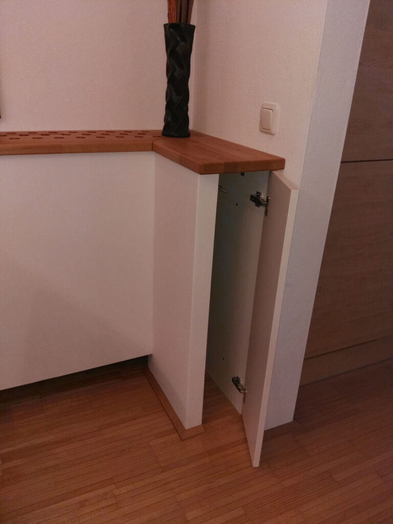 Der Heizkörper ist jetzt hinter weißen Platten und einer mit Bohrungen versehenen Holzabdeckung versteckt. An das vorhandene Mauerstück im Bereich der Küche wurde ein Schrankelement montiert.