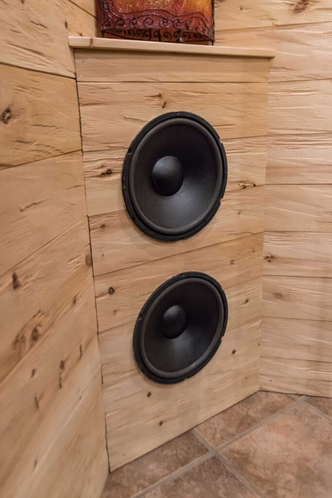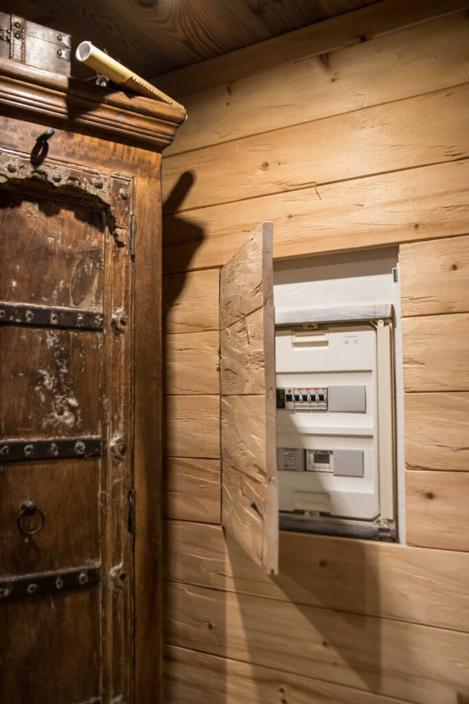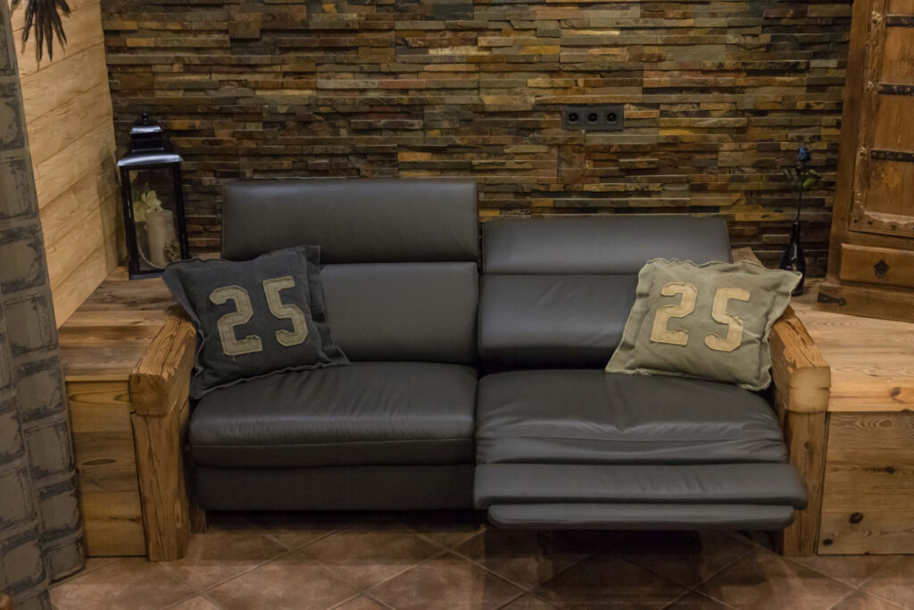 Alle elektronischen Geräte sowie die Beleuchtung wurden optimal platziert. Die Kundschaft wünschte sich ein elektrisch verstellbares Ledersofa. Bei diesem wurden die Armlehnen ebenfalls durch Altholz ersetzt, um es optisch in den Raum zu integrieren.