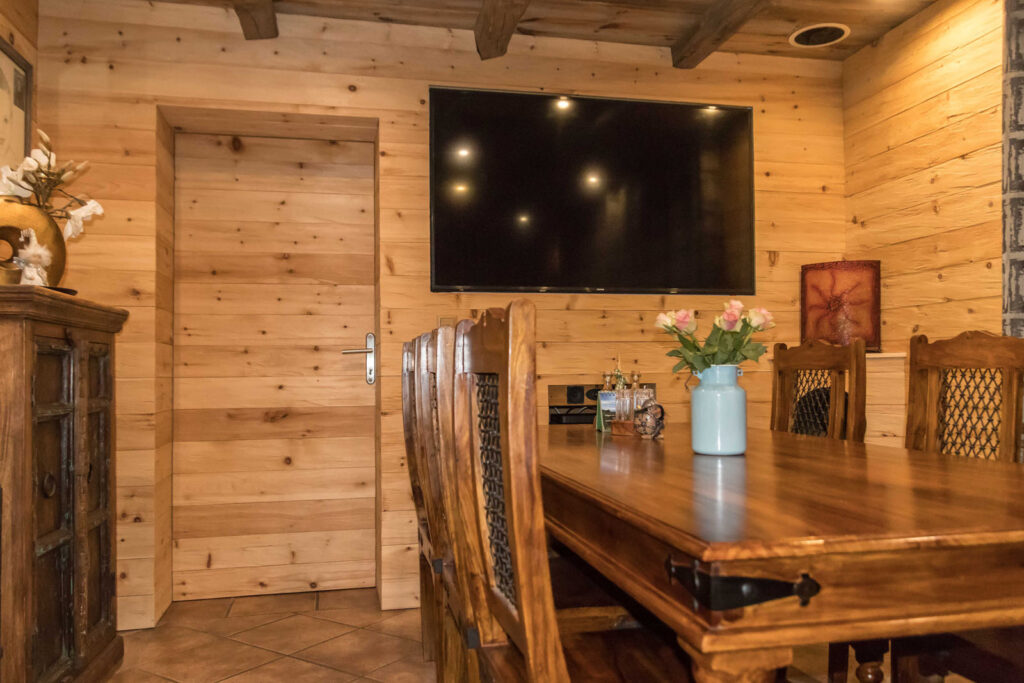 Die "gehackte Zirbenholzverkleidung" an den Wänden und das Altholz an der Zimmerdecke schaffen ein neues Raumklima.