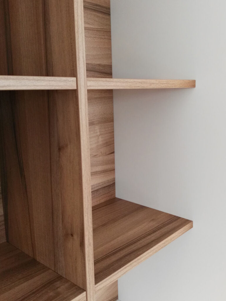 Eine Wohnzimmereinrichtung für gemütliche Abende daheim. Das war das Ziel hinter diesem Projekt. Die Kästen in Farbe Weiß bieten genug Stauraum und auf den Fächern in Nussbaum kann allerlei Deko seinen Platz finden.